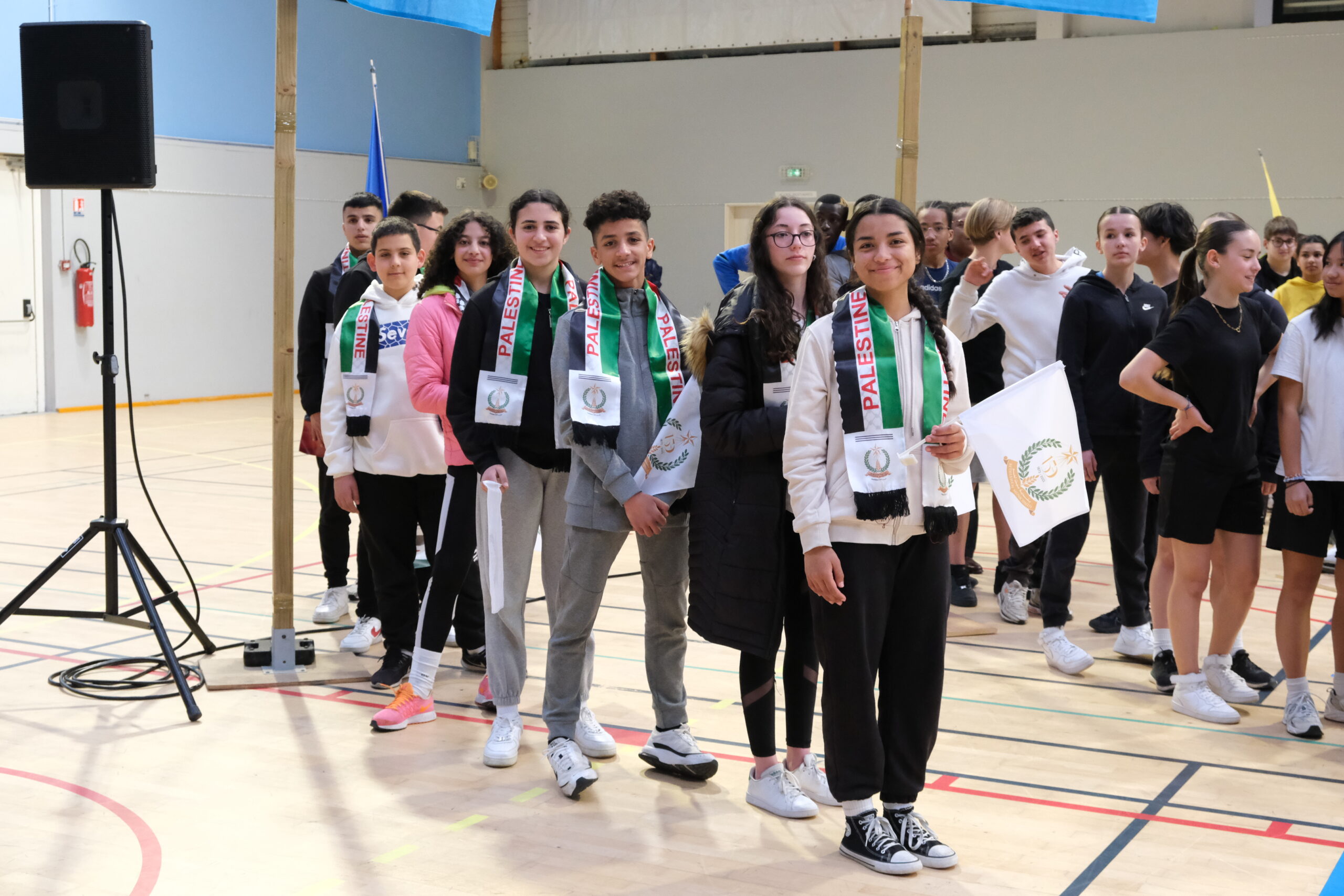Au complexe sportif du Vigneau, les Olympiades 2023 ont rassemblé une centaine de jeunes de 13 à 15 ans, venus des villes jumelles et de Saint-Herblain. Ici, la délégation de Bethléem.