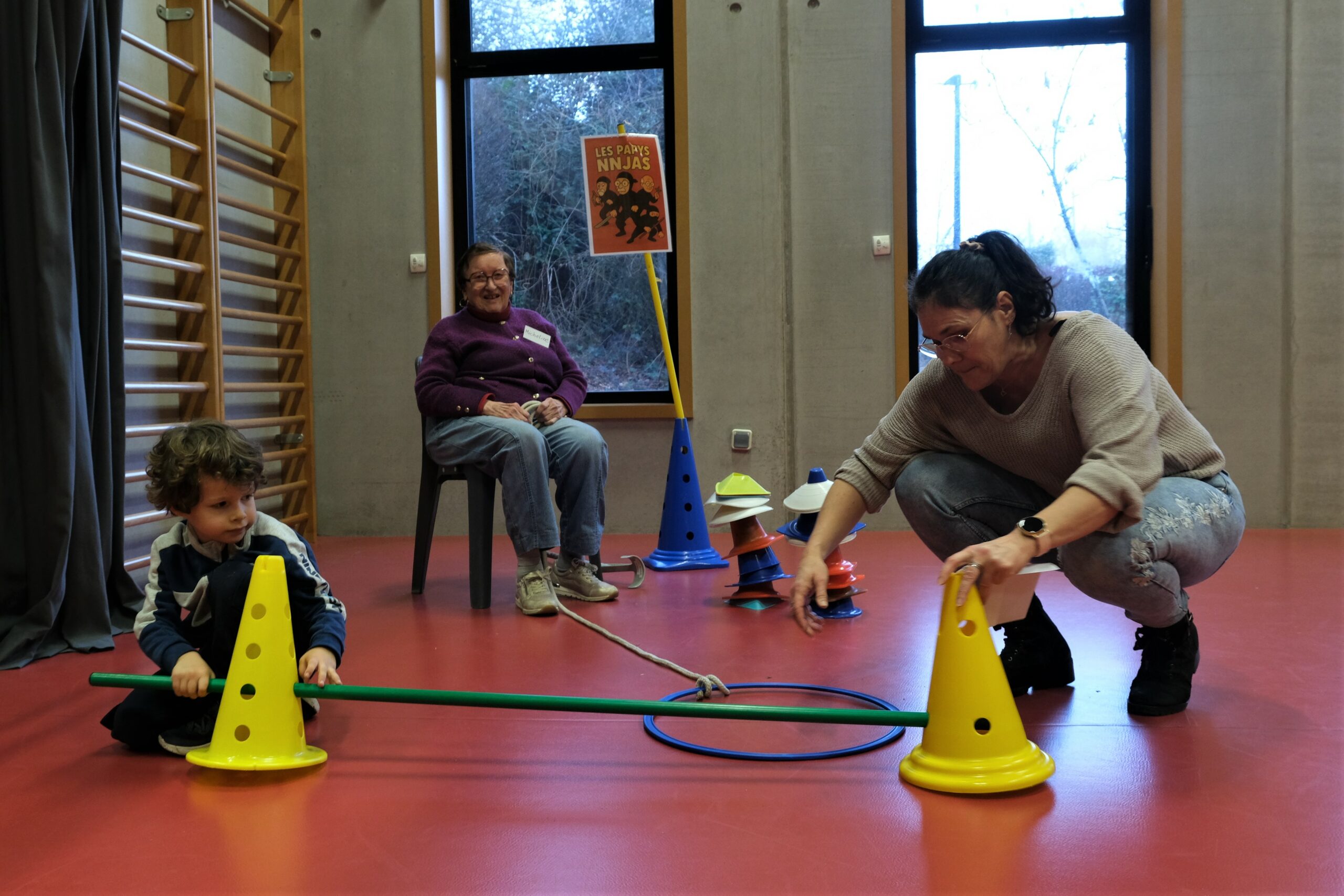 Comme tous les mercredis après-midi, Sacha, Léon, Sarah-Louise et leurs camarades, âgés de 4 à 5 ans, investissent le complexe de l’Angevinière pour une heure de multisports. Ce 10 décembre, la séance est un peu particulière. Ils vont former des binômes avec Thérèse, Claudette, Daniel et une petite dizaine de personnes âgées de 65 à 94 ans. Tous fréquentent Les Noëlles, une structure municipale qui accueille à la journée ou la demi-journée des personnes âgées atteintes de troubles cognitifs.